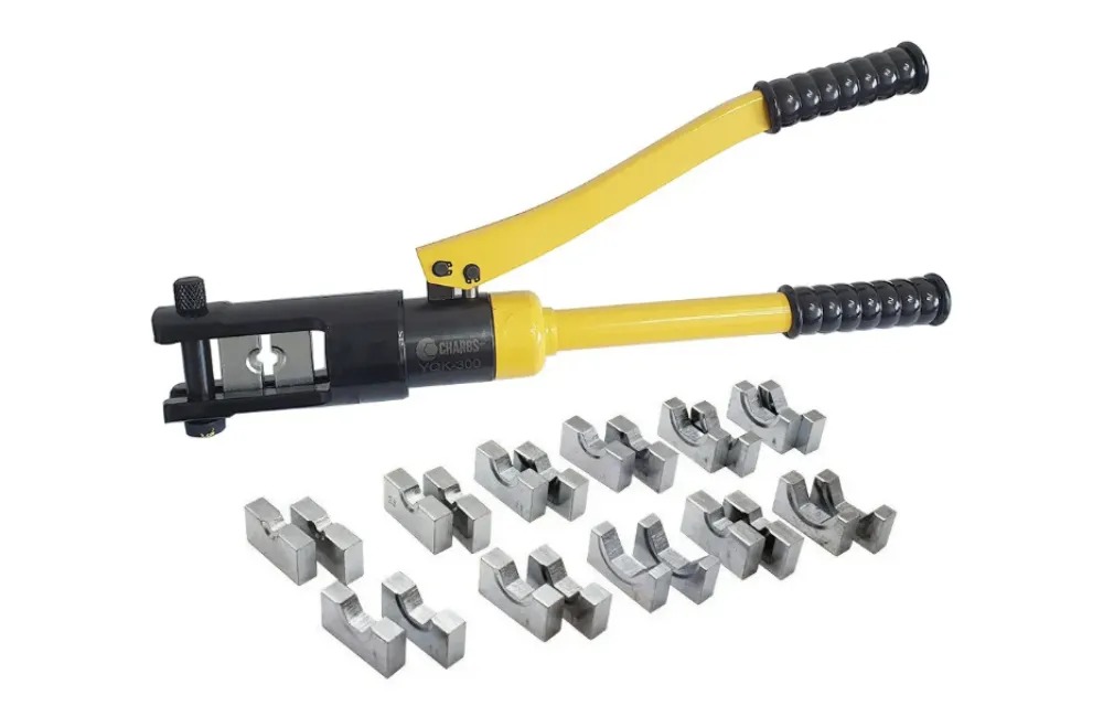 Las prensas están equipadas con troqueles intercambiables diseñados para diferentes secciones de los núcleos. Las prensas hidráulicas facilitan mucho el proceso de engaste ya que requieren menos esfuerzo que las prensas mecánicas. El kit incluye un juego de matrices y un estuche protector.
